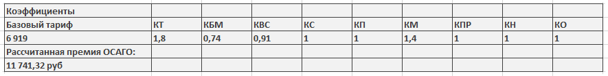 Основная формула: Цена ОСАГО = ТБ × КТ × КБМ × КВС × КО × КМ × КС × КПР × КП